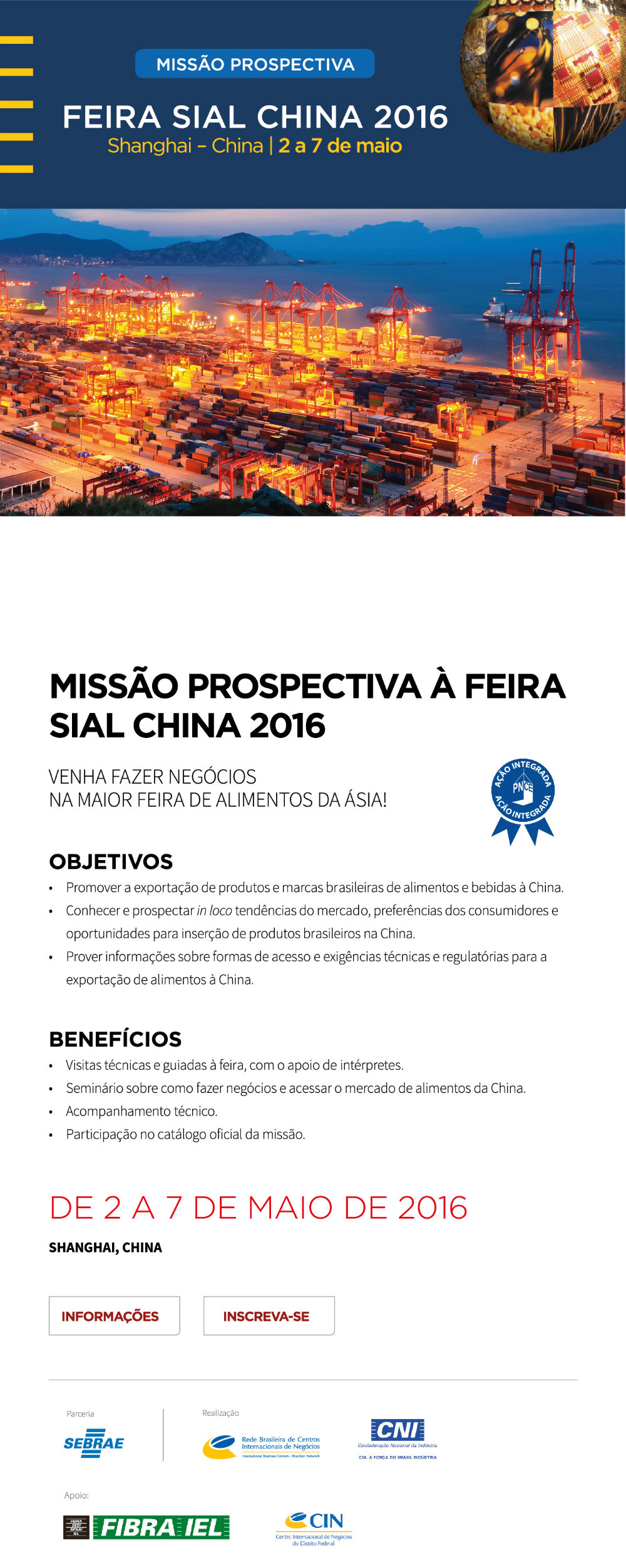 A Rede CIN realizará uma Missão Prospectiva à Feira SIAL China 2016 que acontecerá no período de 2 a 7 de maio de 2016. O objetivo da ação é promover a exportação de produtos e marcas brasileiras à China, permitindo aos empresários o conhecimento e a prospecção in loco de tendências do mercado chinês, preferências dos consumidores e oportunidades para inserção de produtos brasileiros. Além disso, propiciará ao empresário informações sobre formas de acesso e exigências técnicas e regulatórias para a exportação de alimentos à China.